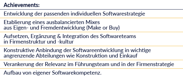 Der Auftrag dieses Unternehmens war, eine Basis-Kompetenz in Software zu schaffen, Verständnis und Transparenz für SW-Reife zu erlangen, eine einfache SW-Grundarchitektur zu entwerfen, ein passende Make or Buy-Konzept für die SW-Entwicklung einzuführen und die Entwicklungsabteilung mit notwendiger interner SW-Kompetenz zu versehen. Kurz: Digitalisierung.